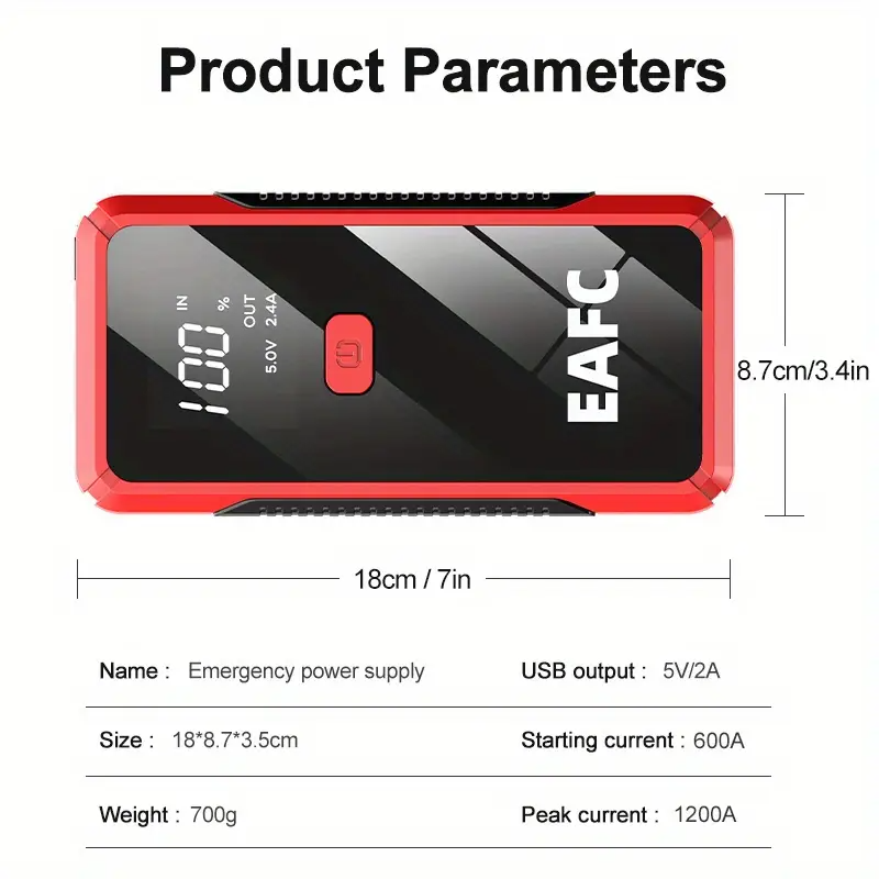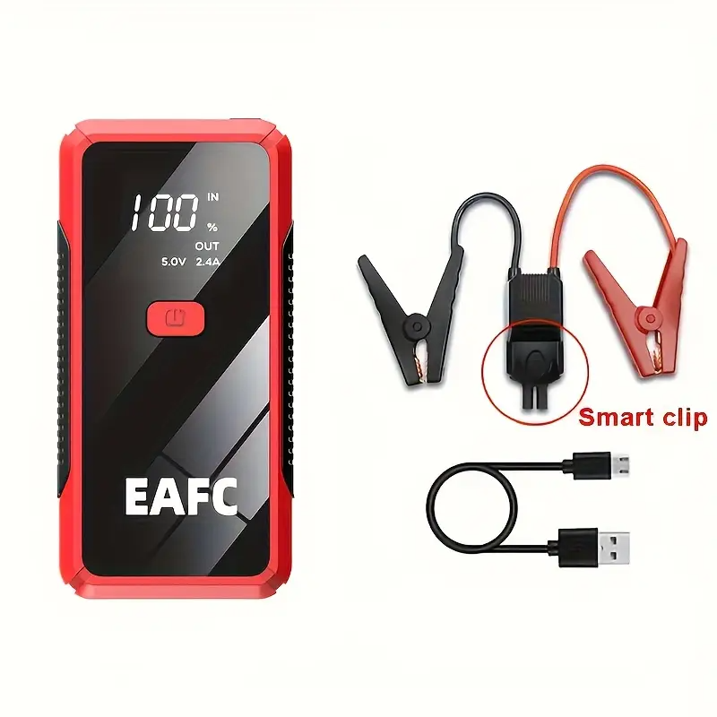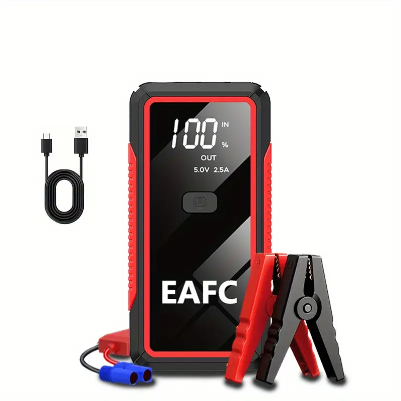 Výkonný štartovací zdroj EAFC s digitálnym LCD displejom, ktorý presne zobrazuje zostávajúcu kapacitu batérie. Dokáže naštartovať väčšinu osobných automobilov a slúži aj ako vysokokapacitná powerbanka s výstupom 5V/2.4A na rýchle nabíjanie smartfónov a tabletov. Robustný dizajn a pokročilé bezpečnostné funkcie.